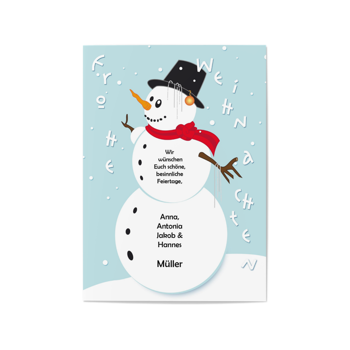 Frosty the Snowman! Die lustige Karte verbreitet jede Menge gute Laune zum Weihnachtsfest. Das freundliche und farbenfrohe Schneemann-Motiv gefällt nicht nur Kindern – ideal für Familien, die Freunden und Verwandten eine Freude zur Weihnachtszeit bereitet wollen. Merry Christmas!