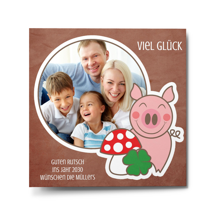 Mit unseren lustigen Glücksschweinchen senden Sie Ihren Freunden und Ihrer Familie einen besonders originellen Neujahrsgruß! Fügen Sie Ihre Fotos und Ihre persönlichen Grußbotschaften ein und starten Sie mit viel guter Laune ins neue Jahr. Ihre Lieben werden begeistert sein!