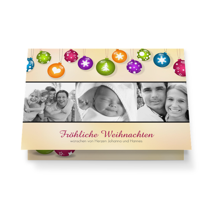 Eine traumhafte und farbenfrohe Weihnachtskarte erwartet hier seinen Empfänger. Mit leuchtenden Weihnachtskugeln und eigenen Bildern verzaubern Sie Ihre lieben Freunde und Verwandten. Wählen Sie aus Schrift, Farbe und warmen Worten und gestalten Sie Ihre ganz eigene Wunderkarte zu einem frohen Weihnachtsfest.