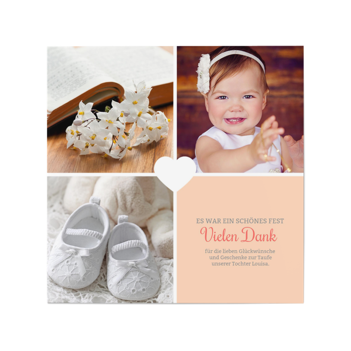 Frisch und pfirsichfarben kommt diese Danksagungskarte zur Taufe daher. Auf herzallerliebste Weise können Sie so Ihren großen Dank aussprechen! Die Karte bietet genügend Platz für die schönsten Fotos der Taufe Ihres Goldschatzes, sodass die Empfänger sofort dahinschmelzen werden.
