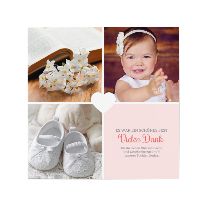 Mit dieser Danksagungskarte zur Taufe in klassischem Rosé sprechen Sie auf herzallerliebste Weise Ihren Dank aus! Diese wundervolle Taufkarte bietet viel Platz für die schönsten Fotos der Taufe Ihres Goldschatzes, sodass die Empfänger sofort dahinschmelzen werden.