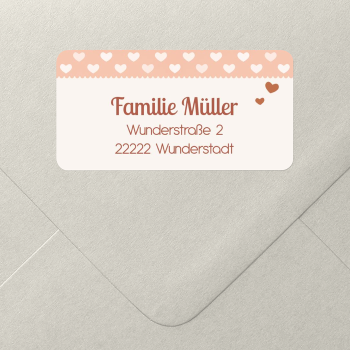 Der zeitlos-niedliche Adressaufkleber mit Herzilein in Apricot. Durch die verspielten Herzchen am Rand des Aufklebers wirkt dieser sehr niedlich und verspielt und eignet sich daher vor allen Dingen für private Post wie Einladungen und Danksagungen. Neben Apricot sind auch Grün und Blau als Farbvarianten verfügbar.