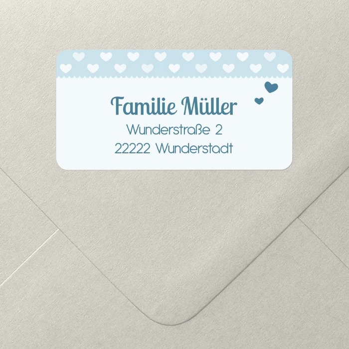 Der niedliche und verspielte Adressaufkleber mit Herzilein in Blau. Dieser Aufkleber lässt durch seine niedliche Erscheinung keinen Zweifel daran, dass er für eine Babykarte gedacht ist. Die Farbwahl wiederum lässt auf einen Jungen schließen, wobei auch apricot und grün als mögliche Farben zur Verfügung stehen.
