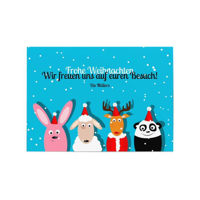 Unsere lustige Weihnachtsbande steht auf dieser Karte vor blauem Hintergrund. Es schneit draußen, also lassen Sie die tierischen Freunde lieber schnell herein! Wenn Sie zum Weihnachtsfest gute Laune verbreiten mögen, ist diese lustige Karte sicher die richtige für Sie! Frohes Fest!