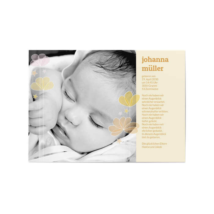 Die leicht transparenten, farbigen Blumen machen aus dem hübschen Bild Ihres Neugeborenen ein echtes Highlight. Überraschen Sie Ihre Familie mit dieser zauberhaften Babykarte.