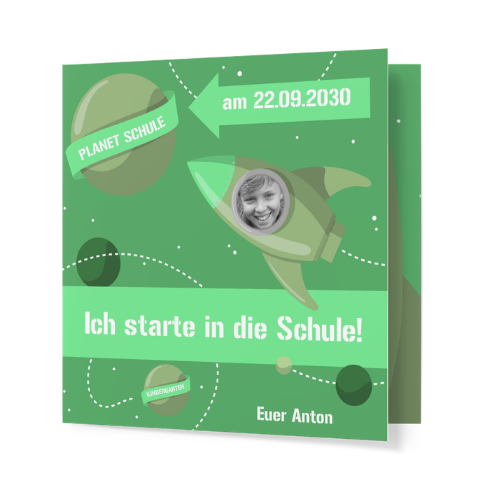 Der 1. Schultag Ihres Kindes muss gefeiert werden! Laden Sie die Familie und auch Freunde mit der lustigen Wunderkarte Rakete in Grün zu diesem spannenden Tag ein. Ergänzt mit einem Foto des Schulanfängers wird daraus eine schöne Erinnerung an dieses Ereignis.