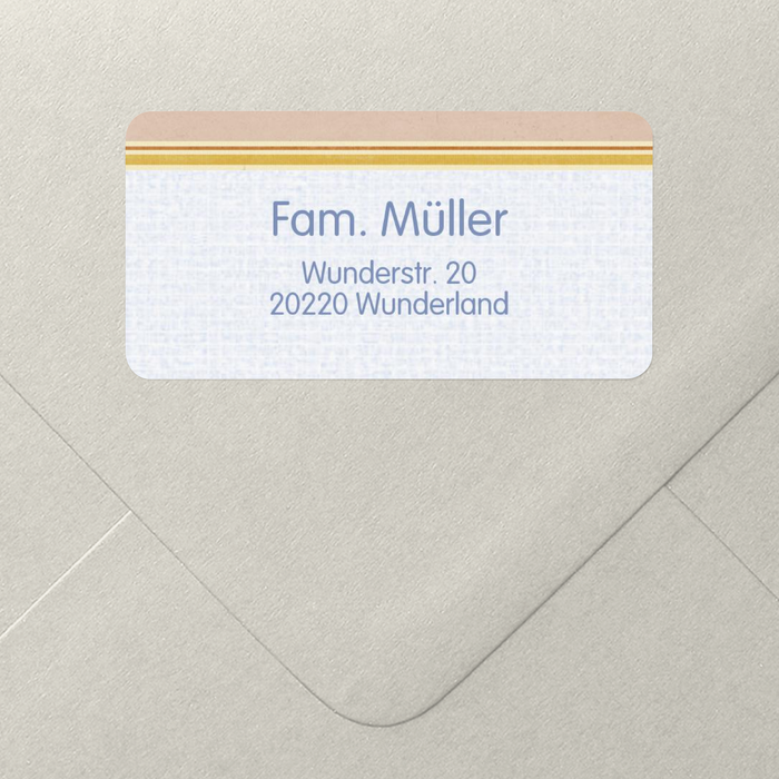 Dieser Adressaufkleber zeichnet sich durch ein sehr dezent gehaltenes Streifenmuster aus, welches den oberen Bereich bedeckt. Trotzdem sind die Schriftfelder schön groß gehalten, sodass der Empfänger Ihrer Post gleich weiß, wessen Umschlag er hier in Händen hält. Laden Sie Ihre Gäste mit der passenden Taufeinladung „Unser Schatz wird getauft in Hellblau“ zum großen Fest ein, und ergänzen Sie perfekt mit dem gleichnamigen Aufkleber.