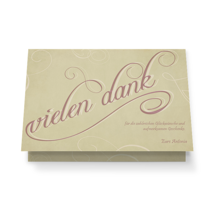 Mit dieser eleganten Karte im Vintage-Stil können Sie sich bei all Ihren Gästen für einen gelungenen Tag bedanken. Die dezenten Schnörkel und der Schriftzug in Altrosa lassen diese Karte leicht verspielt und besonders schick wirken. Eine wirklich besondere Karte für Ihre Danksagung.