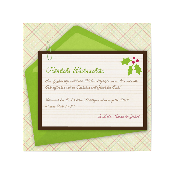 Der Brief auf der Karte – eine pfiffige Designidee, die Lust auf die Feiertage macht. Karomuster, Briefumschlag und Ihr persönlicher Weihnachtsbrief ergeben einen lustigen Hingucker für Ihre Freunde und Ihre Familie. Versenden Sie Ihre ganz persönlichen Glückwünsche und erfreuen Sie Ihre Lieben!