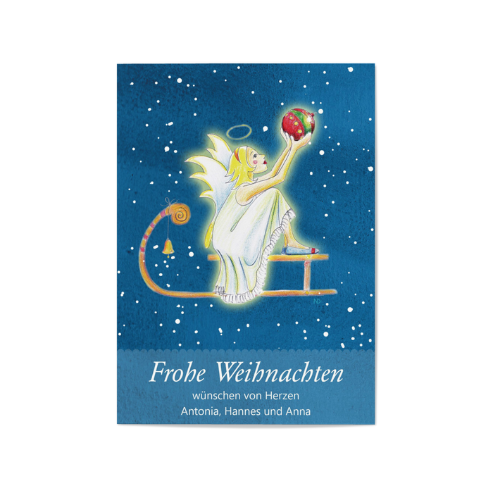 Eine besonders schöne Zeichnung hält diese Karte für Sie bereit: ein weißgewandeter Engel fliegt auf einem Schlitten durch die Sternennacht. Darunter texten Sie einfach Ihren persönlichen Weihnachtsgruß – fertig ist die individuelle Weihnachtskarte, über die sich Freunde und Verwandte ganz besonders freuen.