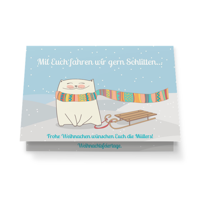 Mit Euch fahren wir gern Schlitten! Die drollige Katze im Comic-Stil mit dem bunten Schal verbreitet gute Stimmung zu Weihnachten! Wenn Sie es gerne originell und lustig mögen ist diese "tierische" Weihnachtskarte Ihre Wahl! Gute Fahrt und frohes Fest!
