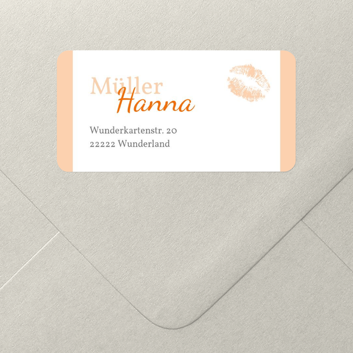 In pastelligem Apricot wirkt dieser Adressaufkleber sehr zart und sanft. Genau das Richtige für Ihre Anschrift, wenn Sie einen dezenten Aufkleber bevorzugen. Er ist nicht nur zu Privatem Anlass geeignet, passt aber perfekt zu der Fotokarte „Zarter Knutscher“.