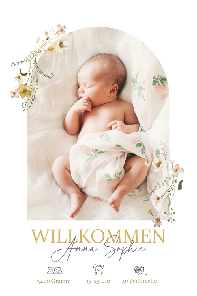 Eine liebevolle Geburtskarte mit dem Lieblingsfoto eures Babys im blumigen Torbogen. Heißt euren Sprössling willkommen auf dieser Welt und verratet überglücklich die Geburtsdaten mit den Symbolen Waage, Wecker und Maßband.