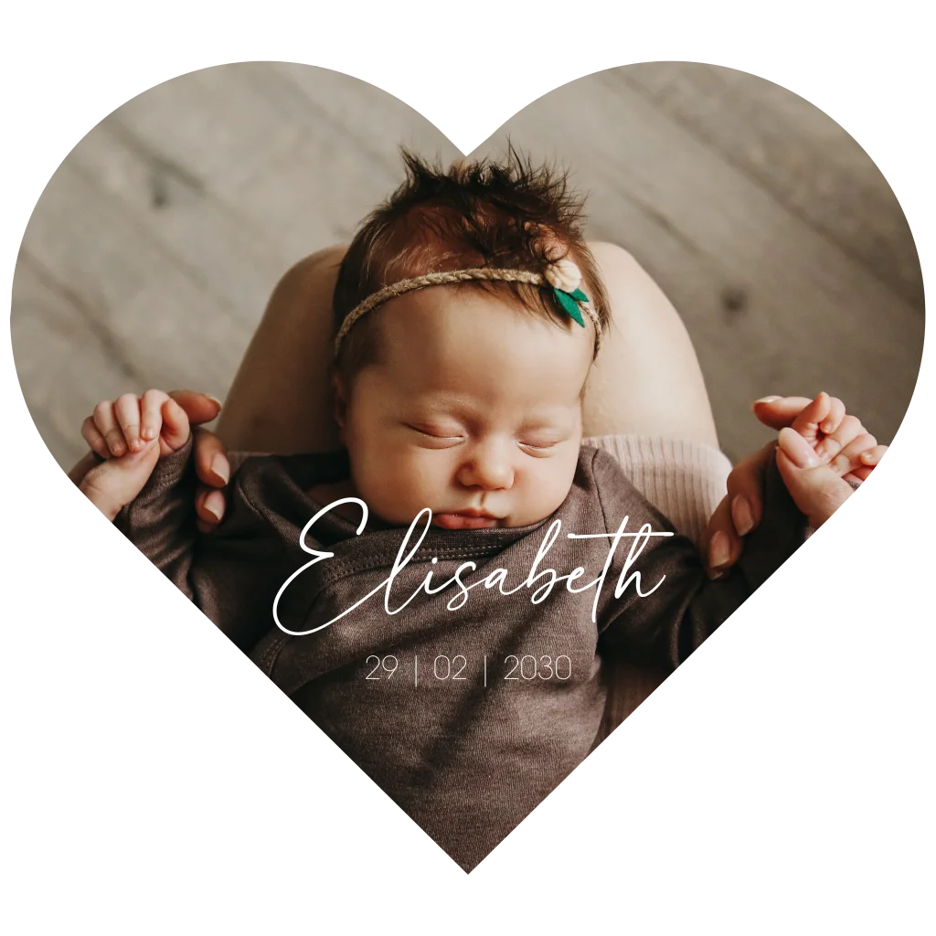 Ganz bezaubernd ist diese Karte in Form eines Herzes. Ladet vollflächig ein Foto hoch und platziert den Namen und das Geburtsdatum dazu.
