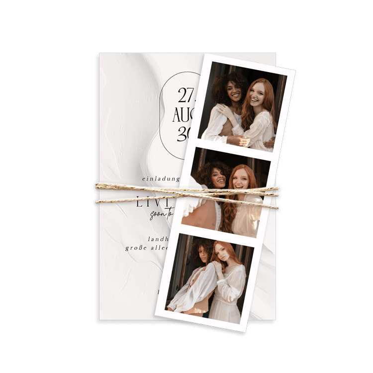 Moderne Hochzeitseinladung mit Fotocollage in Weiß. Gestalte das Design nach deinen Wünschen in unserem Editor.