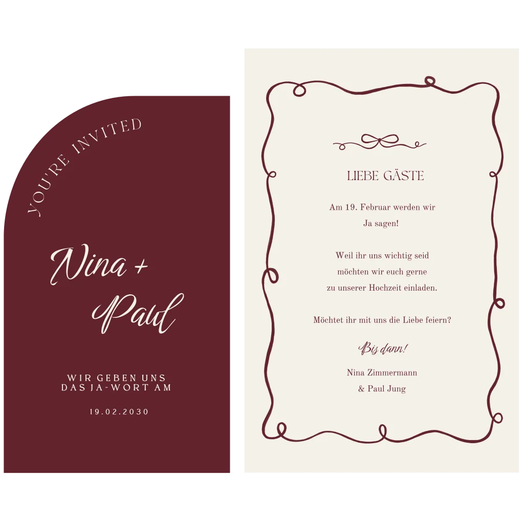 Elegante bordeauxrote Hochzeitseinladung, personalisierbar in unserem Editor für euren besonderen Tag.