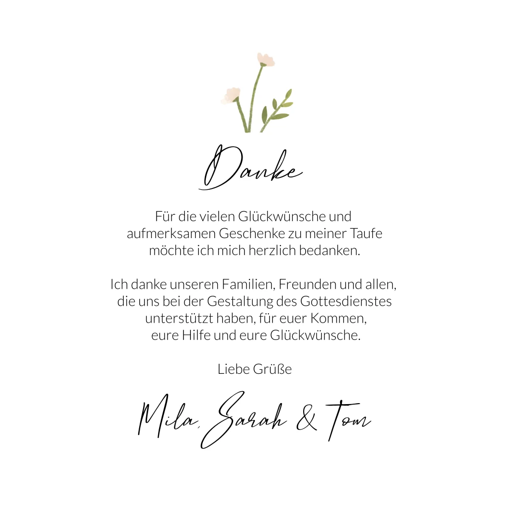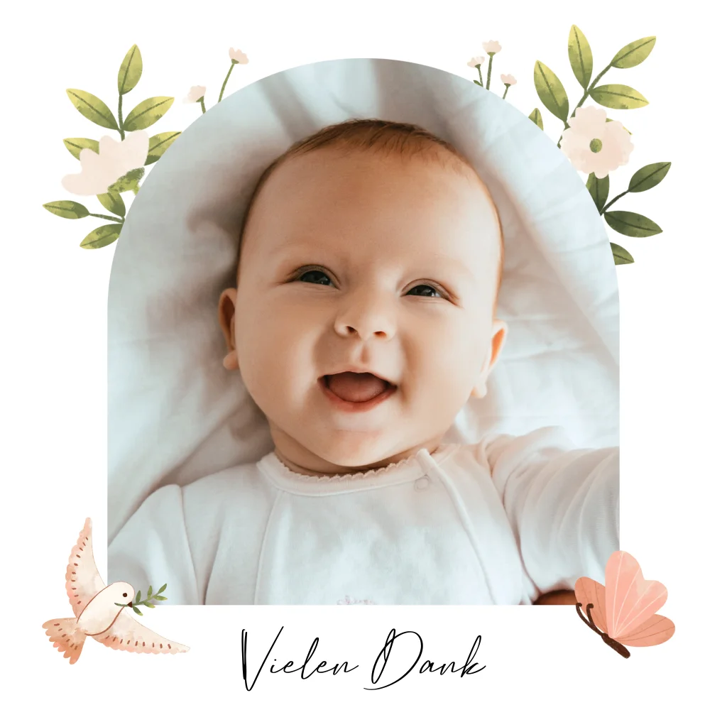 Ziere den feinen Blütenbogen auf der Vorderseite mit dem Foto des Tages vom Täufling. Vögelchen und Schmetterling sind an deiner Seite. Übermittel ein blumiges Vielen Dank an deine Liebsten und zeige dich erkenntlich für die Gestaltung des Gottesdienstes und die tolle Tauffeier.