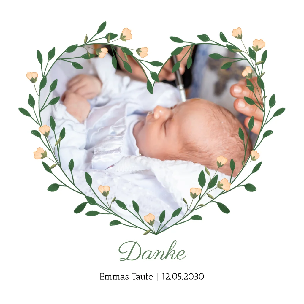 Danke sagen mit dieser schönen Karte fällt Euch sicherlich ganz leicht. Die Taufe eures Kindes hat euch glücklich gemacht und das soll nun die Familie und Freunde wissen. Ein Bild eures Kindes wird als Herz umrandet mit Blumen dargestellt und signalisiert eure Dankbarkeit.