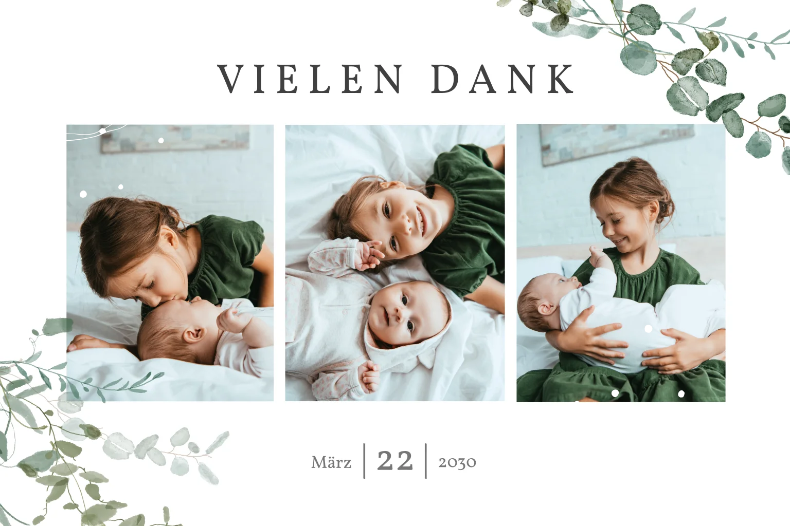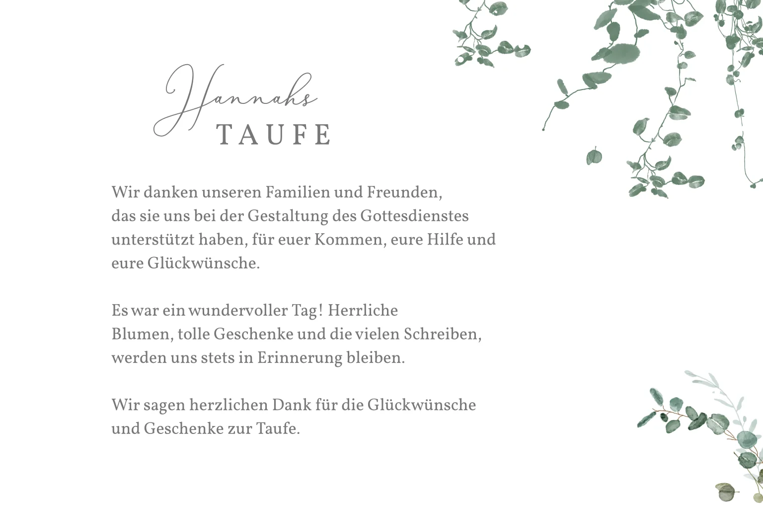 Der zarte Eukalyptus, die feinen Goldakzente und die Fotos des großen Tages sind die perfekte Mischung, damit du die Taufe eures Babys zum tollen Abschluss bringen kannst. Bedanke dich vielmals für die herzlichen Glückwünsche und die tollen Geschenke. Ein tolles gemeinsames Ritual.