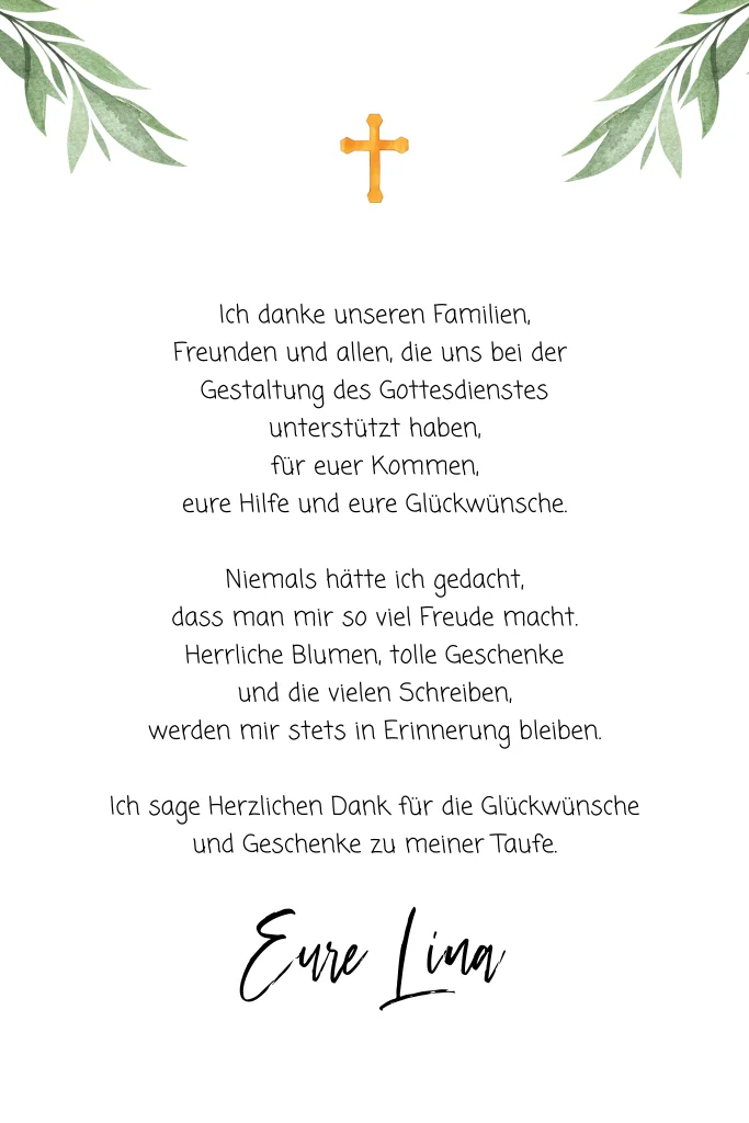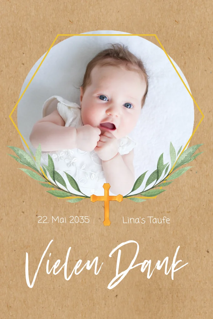 Niedliche Dankeskarte zur Taufe eures Kindes. Sagt Danke an eure Liebsten für das Dasein und die vielen Glückwünsche und Geschenke. Die Karte ist in Krafpapier-Optik mit einem hübschen Blätterkranz und orange/gelben Kreuz.