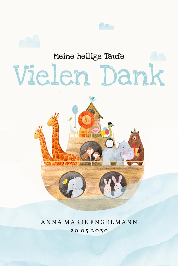 Diese süße Karte ist perfekt um deine Liebsten zur Taufe eures Kindes Danke zu sagen. Die Arche Noah strahlt Freude aus, genauso wie ihr, wenn ihr an diesen Tag zurück denkt. Auf der Innenseite findet ihr Platz für persönliche Worte.