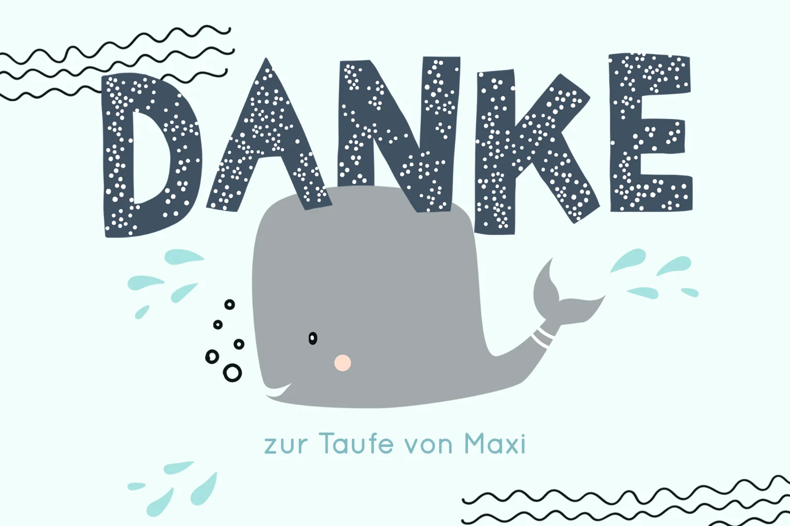 Sorge mit dieser niedlichen Dankeskarte mit dem kleinen fröhlichen Wal für einen perfekten Abschluss der Taufe. Bedanke dich für den bezaubernden Tag, die zahlreichen Glückwünsche und tollen Geschenke. Ein unvergesslicher Tag voller Freude und Liebe.