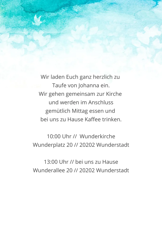 Die kleine Taube mit Ölzweig lässt sich im türkisen Aquarell treiben. Innen ist Platz für dein Lieblingsfoto. Perfekt für deine individuelle Einladungskarte zur Taufe. Lade elegant zum zentralen Ritual ein und freue dich auf eine schöne Feier.