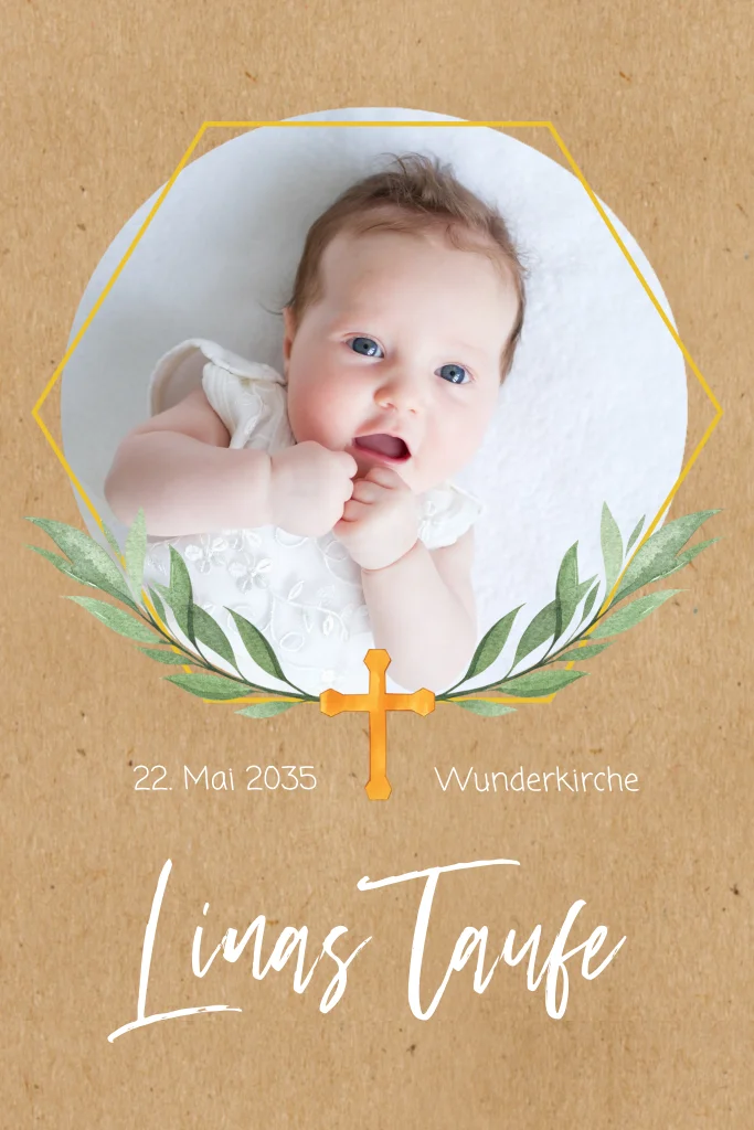 Das Foto des Täuflings wird umschmeichelt von einem kleinen Taufkreuz mit grünen Zweigen und einem Hexagon in Goldoptik auf Kraftpapieroptik. Perfekt für deine individuelle Einladungskarte zur Taufe. Lade herzlichst zum zentralen Ritual ein.