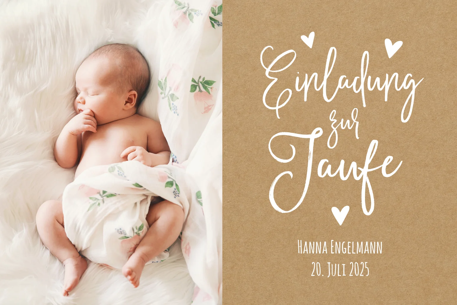 Eine liebevolle Einladungskarte zur Taufe auf Kraftpapieroptik mit einem geschwungenen dekorativen Schriftzug neben dem aktuellen Lieblingsschnappschuss des Taufkindes. Ladet zum zentralen Ritual ein mit anschließendem Mittagessen und Kaffeetrinken.
