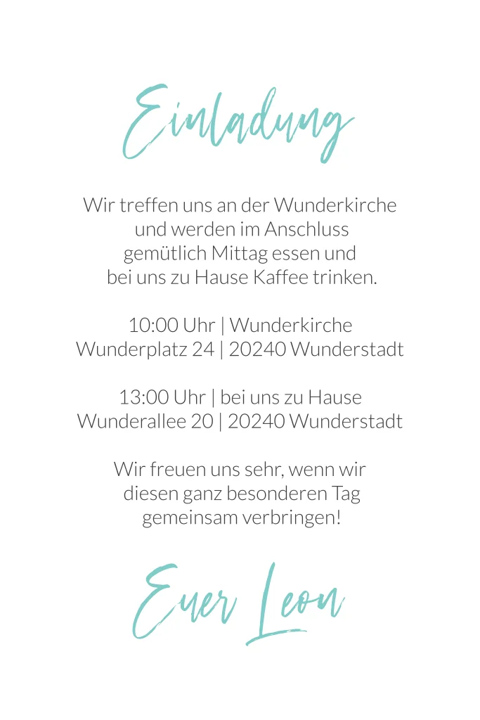 Gestalte diese stylische Karte zu Taufe deines Kindes und lade deine Familie und Freunde ein. Das große Kreuz in türkiser Wasserfarbe passt perfekt zu dem großen Tag. Auf die Innenseite ist ausreichend Platz um nähere Informationen zu deiner Feier zu schreiben.