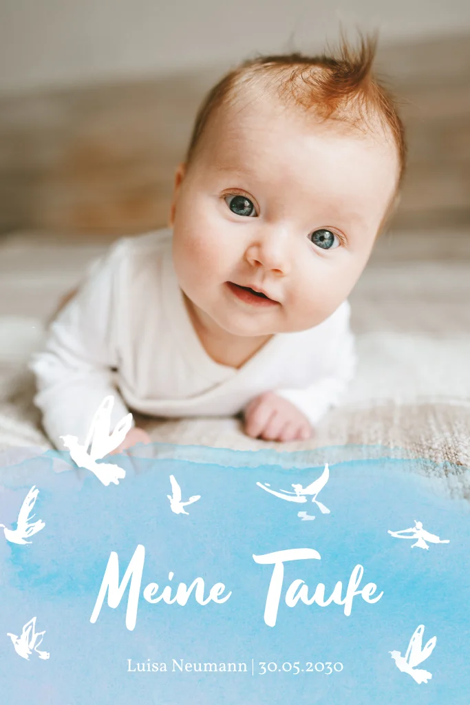 Ein liebevolle Einladungskarte zur Taufe mit weißen Tauben auf hellblauem Aquarellhimmel mit lilanen Akzenten. Platziere auf der Vorderseite den aktuellen Lieblingsschnappschuss des Taufkindes und lade herzlichst zum zentralen Ritual ein.
