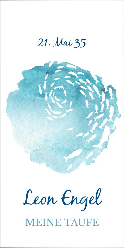 Diese Kerze zur Taufe ist mit einem Fischschwarm auf blauen Untergrund. Füge den Namen deines Kindes sowie das Datum des besonderen Tages hinzu.