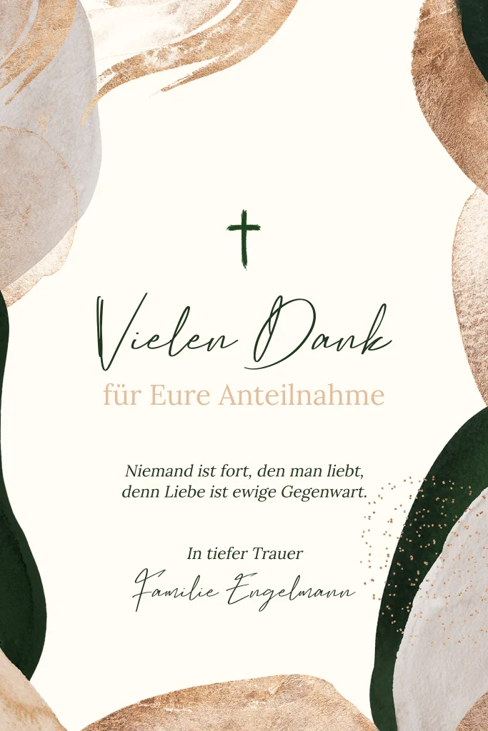 Betten Sie Ihre Danksagung für die tröstenden Worte und die Beileidsbekundungen in der Weichheit der Kurven in den sanften Farben Grau, Grün und Roségoldoptik auf beigem Hintergrund. Erinnern Sie mit einem schönen Foto an die verstorbene Person und verfassen Sie persönliche Worte im Innenteil.