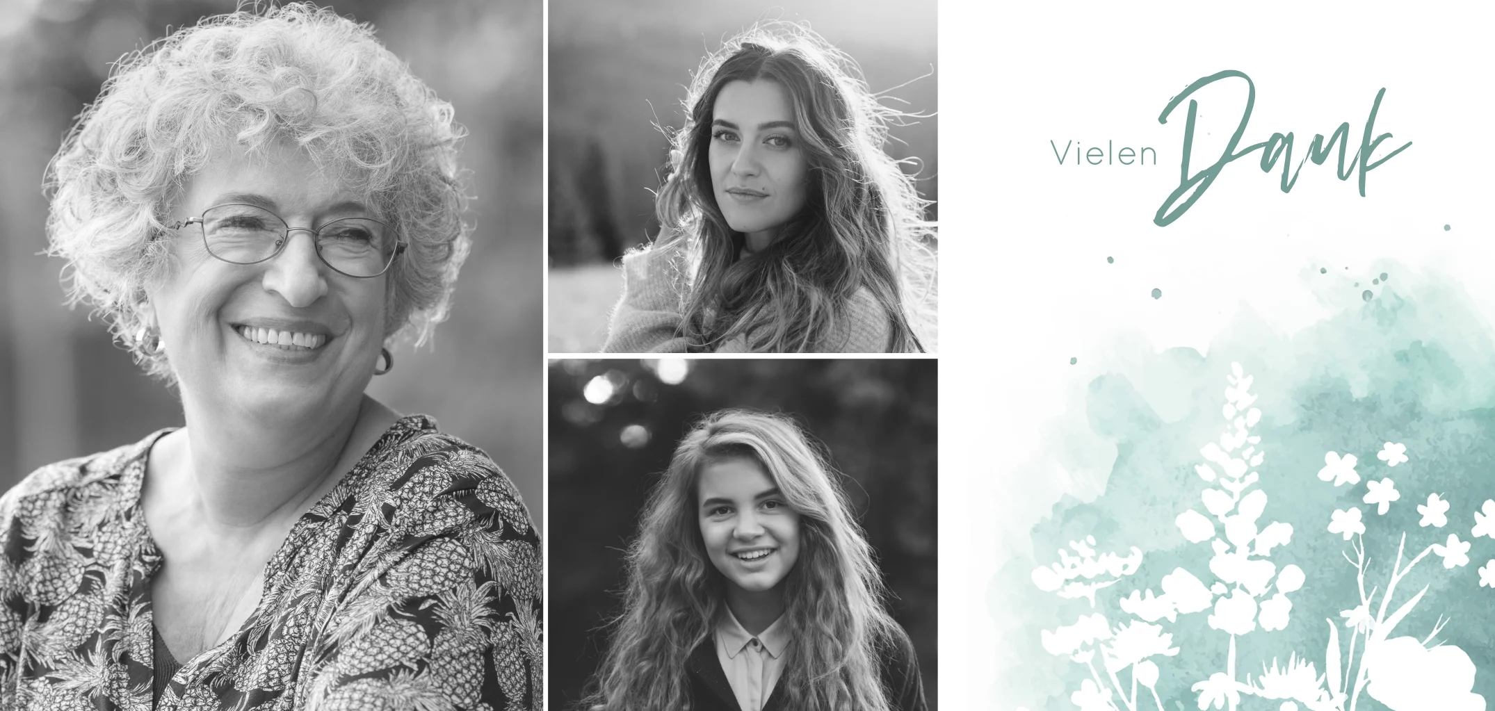 Erinnern Sie mit drei Fotos aus verschiedenen Lebensphasen an die verstorbene Person neben der mintgrün-türkisen Aquarellwiese und bedanken Sie sich im Ticketformat für die Anteilnahme und die tröstenden Worte, die Sie erreicht haben. Tröstlich zu wissen, dass Sie nicht allein sind mit dem Verlust.