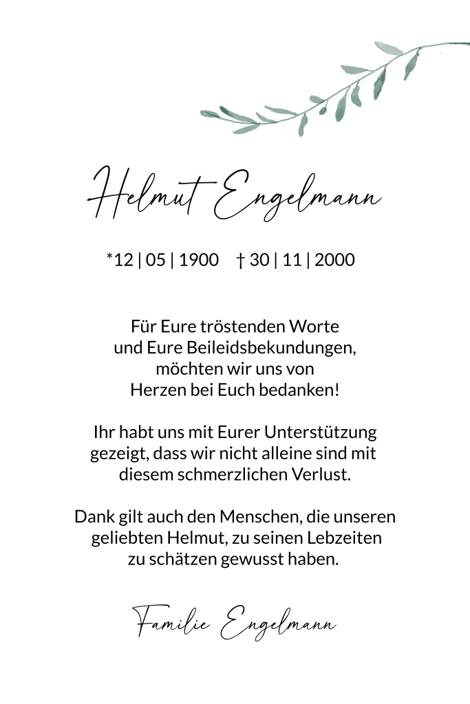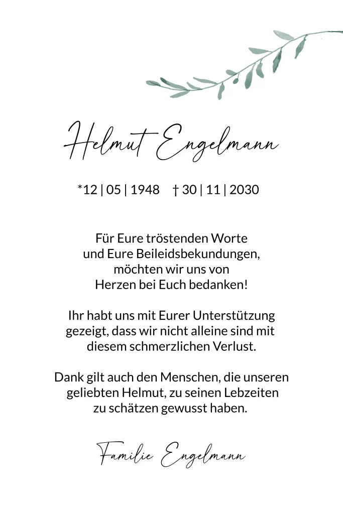 Die zarten Blätterzweige auf dieser Karte symbolisieren das Leben und die Hoffnung, die auch in Zeiten der Trauer weiterblühen. Sagen Sie mit dieser Karte Danke für die Unterstützung und das Dasein in der schwierigen Zeit.