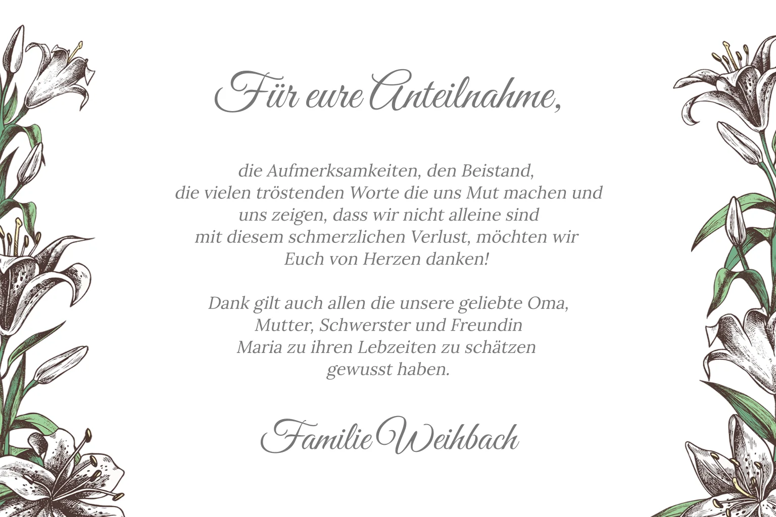 Hübsche Lilien verzieren diese Karte. Platzieren Sie auf der Kartenmitte ein Foto und darunter den Namen der geliebten verstorbenen Person. Sagen Sie so vielen Dank für die Unterstützung in der schweren Zeit.