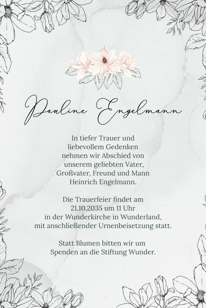 Betten Sie Ihre Danksagung für die tröstenden Worte und die Beileidsbekundungen in der Weichheit des grauen Marmor mit den Blüten und Blättern der Magnolie. Erinnern Sie mit einem schönen Foto an die verstorbene Person und informieren Sie über den Termin für die Beisetzung.