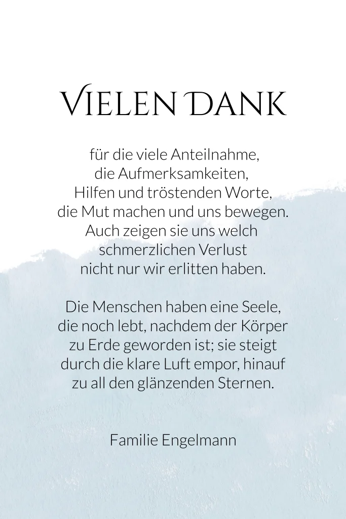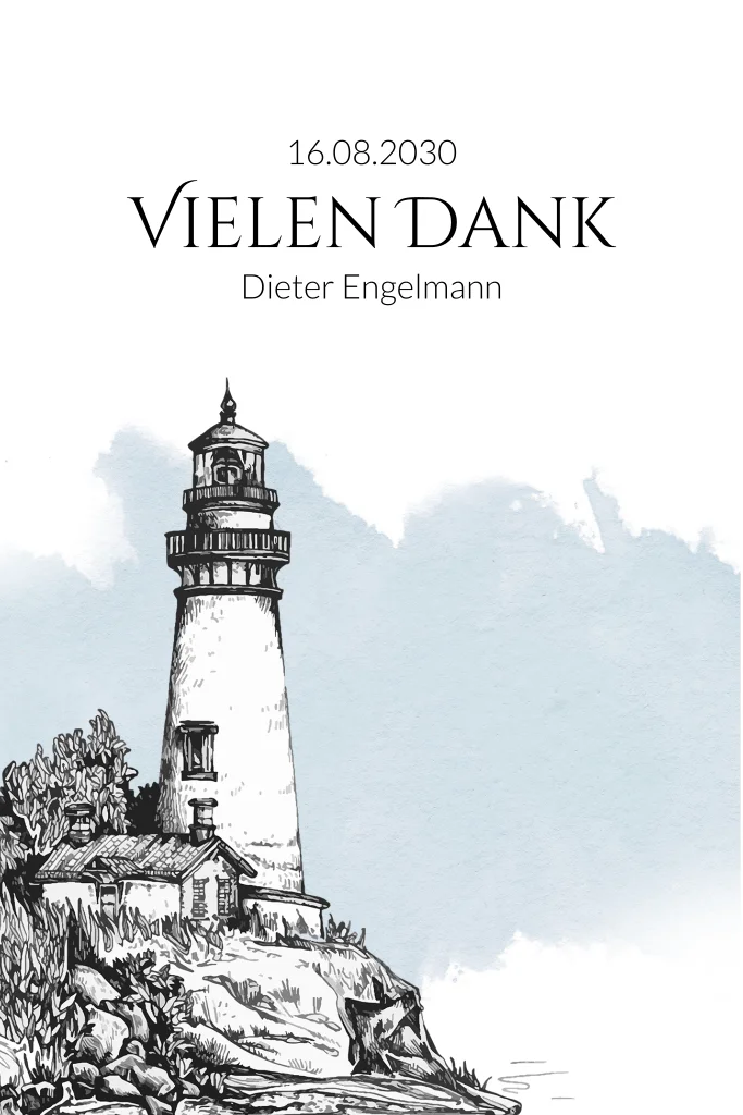 Die kleine Hütte und der Leuchtturm am Hang weisen dem Verstorbenen den Weg durch die ruhige See. Fest verankert bleibt die Person in Ihren Erinnerungen. Bedanken Sie sich bei den Hinterbliebenen mit einem Erinnerungsfoto für die tröstlichen Worte und Hilfen.