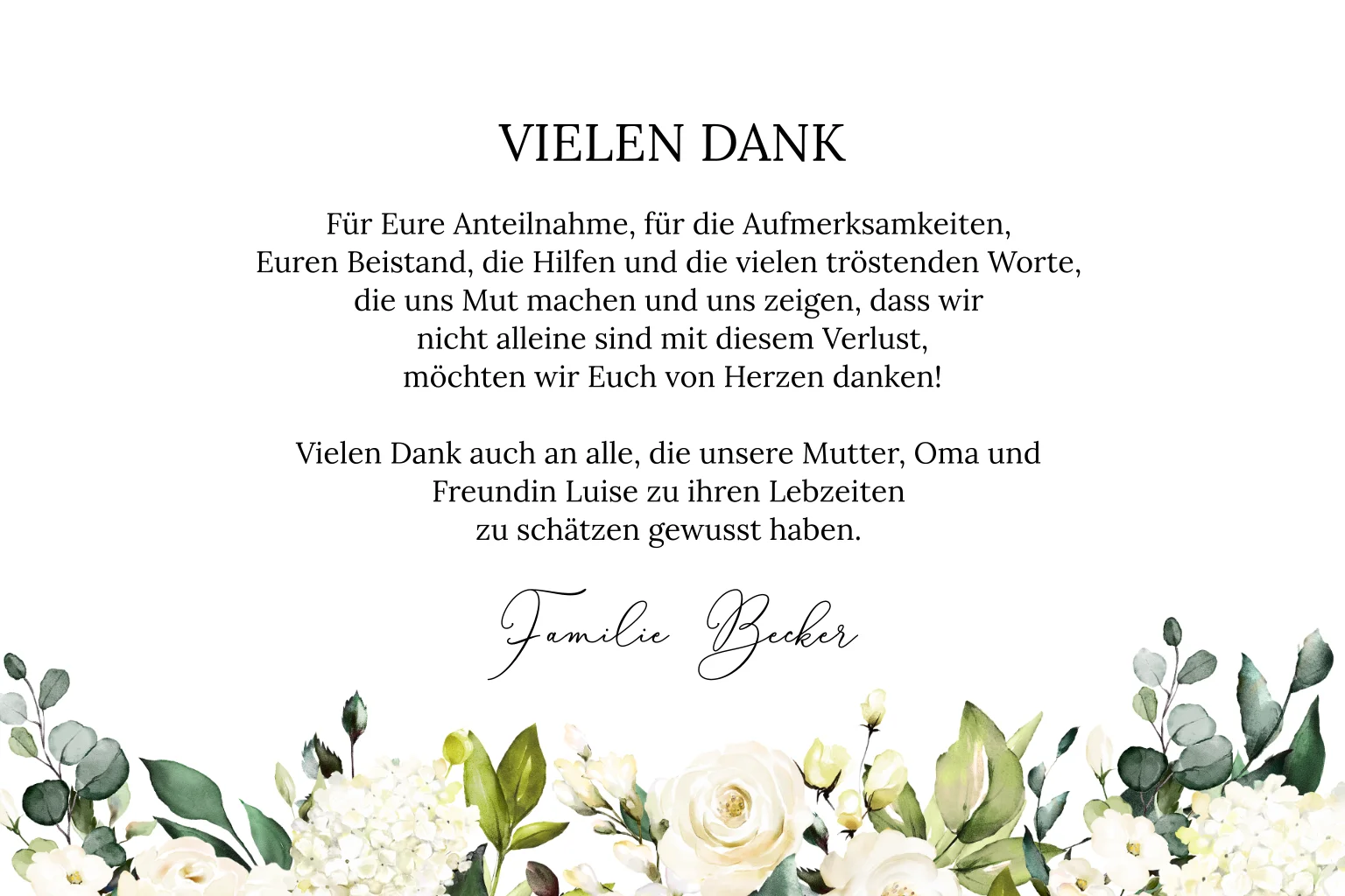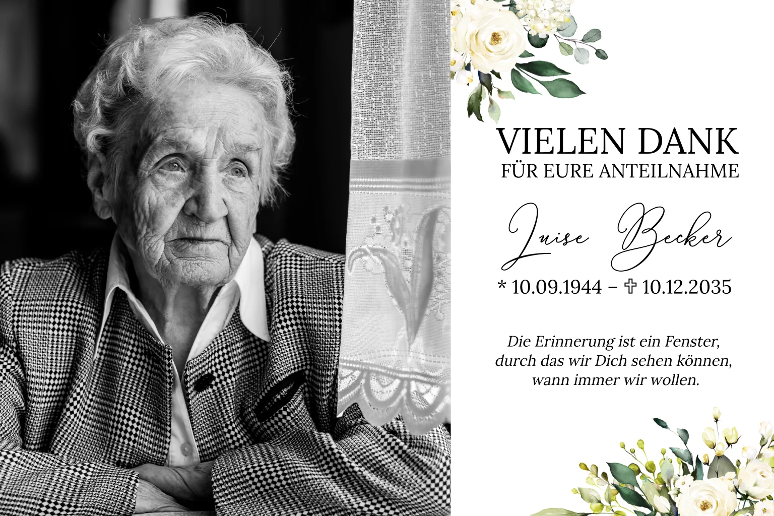 Bringen Sie mit dieser schönen Trauer Dankeskarte mit dem Blumenmotiv Weiße Rose den Verstorbenen in Erinnerung. Platzieren Sie ein Lieblingsfoto auf der Vorderseite und widmen Sie persönliche Worte an die Trauernden.