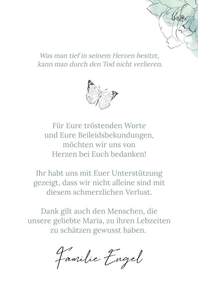 Die elegante Trauer Dankeskarte mit floralen Akzenten auf mintgrünem Aquarell bietet Platz für ein ovales Erinnerungsfoto an den Verstorbenen. Lassen Sie den wertvollen Augenblick aufleben. Bedanken Sie sich für die tröstenden Worte und die Unterstützung.
