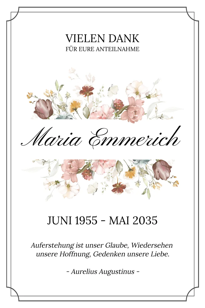 Der Name der verstorbenen Person gebettet in einem Meer aus Wildblumen. Gedenken Sie mit einem schönen Foto an die vergangene Lebenszeit und bedanken Sie sich aufrichtig für Anteilnahme und die tröstenden Worte, die Sie erreicht haben. Tröstlich zu wissen, dass Sie nicht allein sind mit dem Verlust.