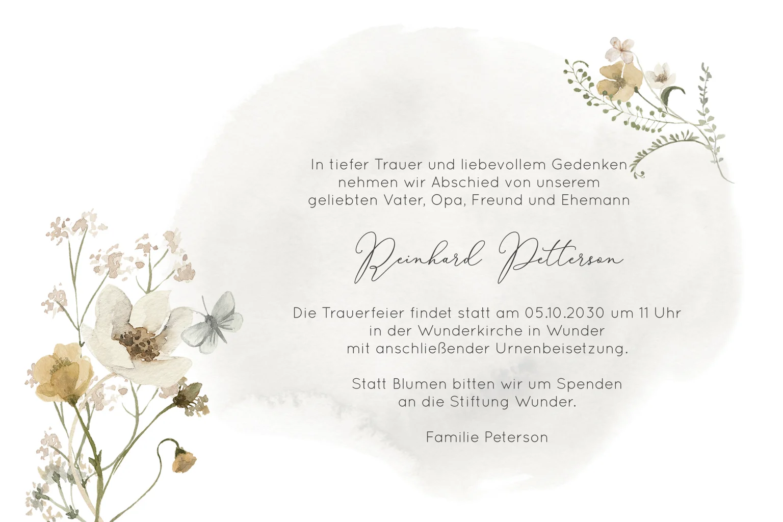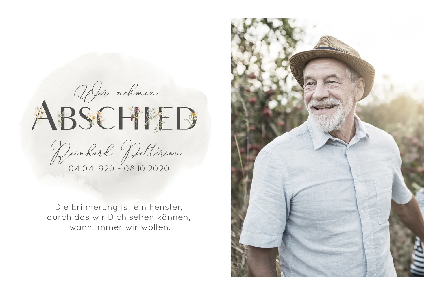 Der Verlust ist groß, das Lebewohl fällt schwer. Bescheren Sie dem Verstorbenen einen floralen Abschied. Erinnern Sie mit einem schönen Foto an den Verstorbenen. Umarmt von zarten Blumen sprechen Sie im Innenteil die Einladung zur Beisetzung aus.