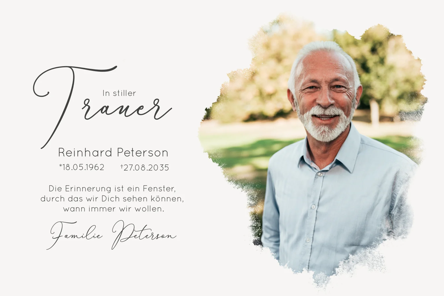 Platzieren Sie ein schönes Erinnerungsfoto der verstorbenen Person im Aquarellfenster für einen besonderen Abschied. Laden Sie in stiller Trauer zu dem schwersten Gang, der Urnenbeisetzung ein. Bitten Sie auf Blumengestecke zu verzichten und stattdessen Spenden zu entrichten.