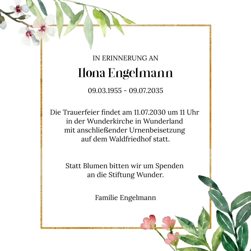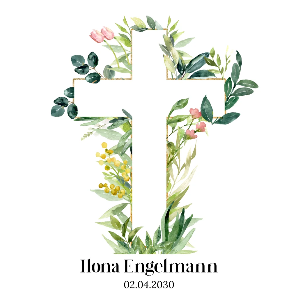 Das Totenkreuz gebettet in sanften Blumen und Grün segnet das Ende der verstorbenen Person. Laden Sie stilvoll zum schweren letzten Gang, die Trauerfeier mit Urnenbeisetzung ein. Bitten Sie im Anschluss zu einem gemeinsamen Beisammensein und Erinnern. Innen ist Platz für ein schönes Erinnerungsfoto.