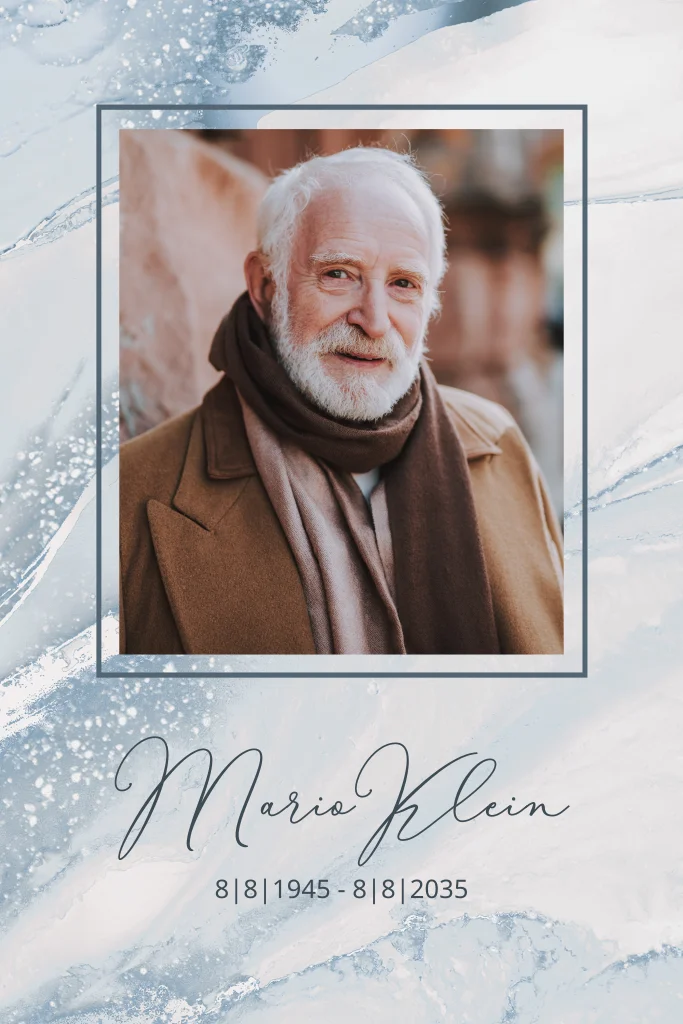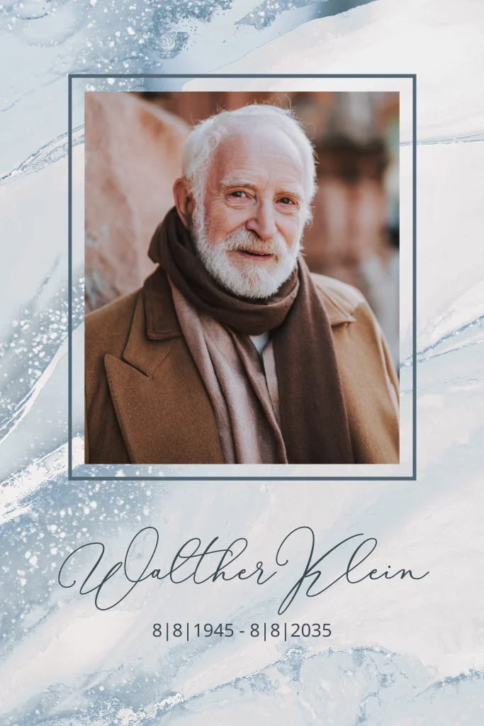 Laden Sie mit dieser eleganten Einladungskarte in grau hellblauer Marmoroptik zum schwersten Gang, die Trauerfeier mit Urnenbeisetzung ein. Platzieren Sie in dem taubengrauen Rahmen ein Erinnerungsfoto des Verstorbenen und teilen Sie mit, dass es an der Zeit ist, Abschied zu nehmen.