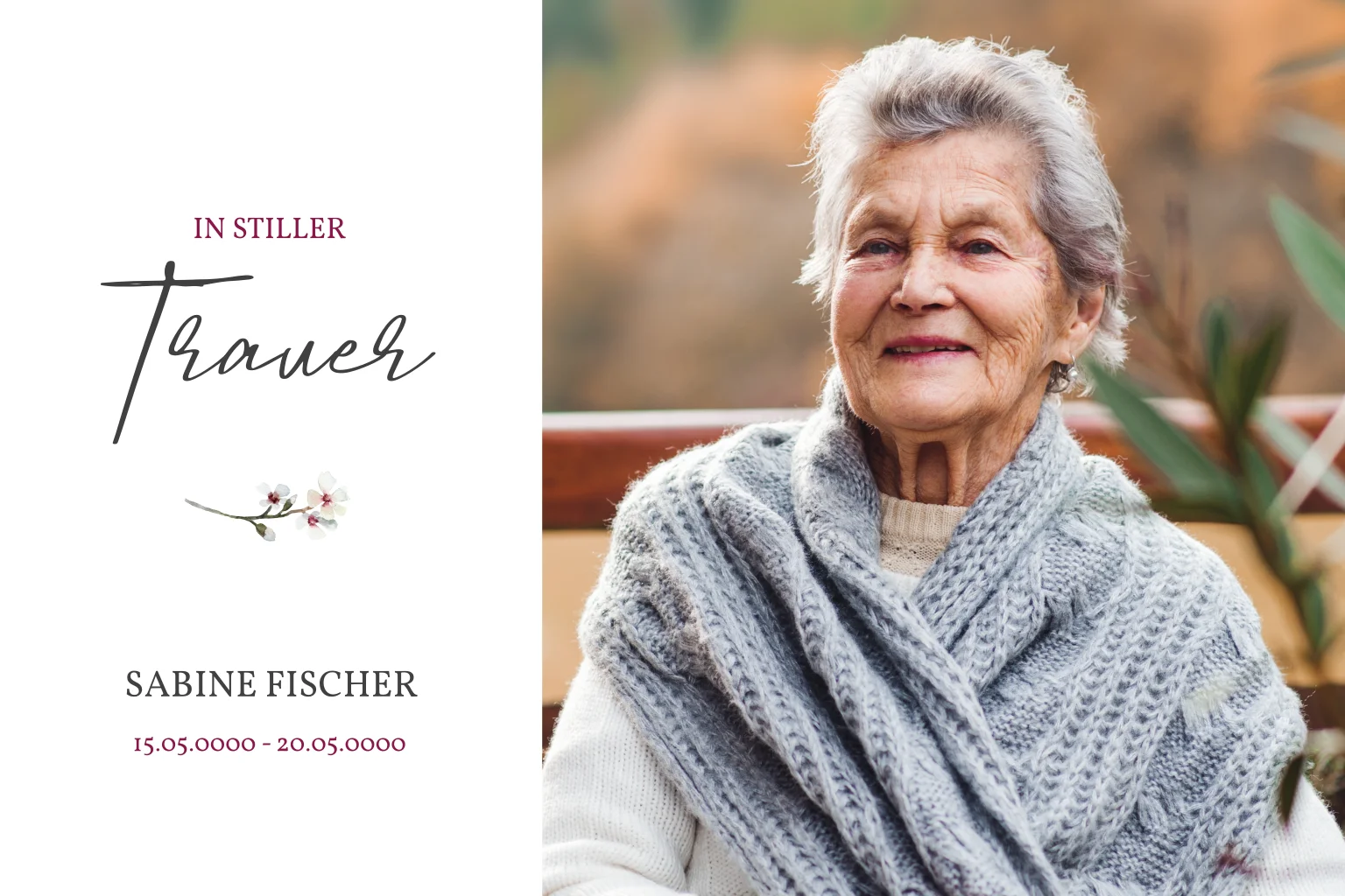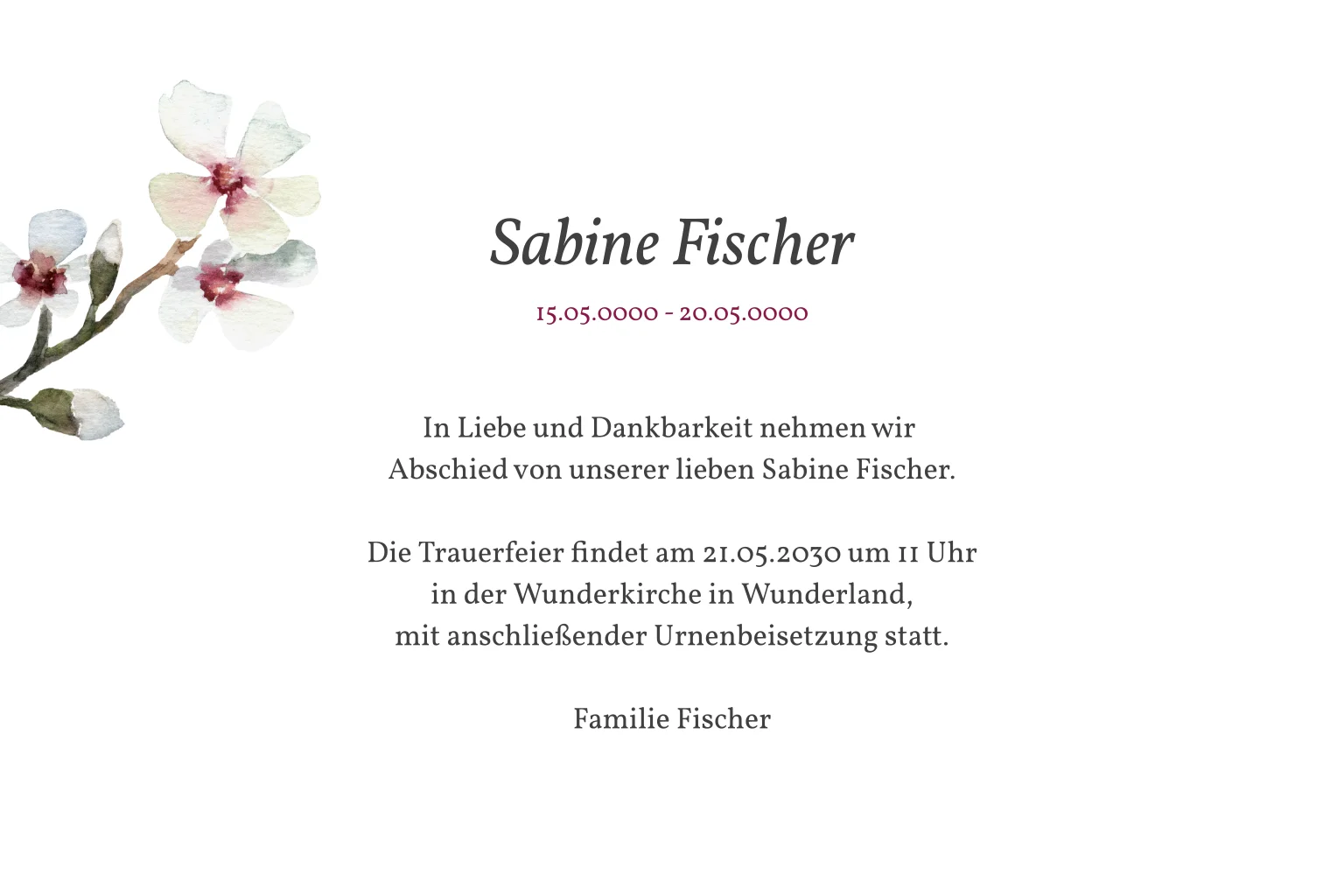 Mit der zarten Kirschblüte und dem Lieblingsfoto des Verstorbenen kündigen Sie seicht an, dass es Zeit ist, Abschied zu nehmen. Laden Sie im Anschluss an die Trauerfeier zum Beisammensein in einem Café ein, um gemeinsam in Erinnerungen zu schwelgen.