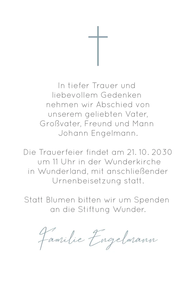 Laden Sie mit dieser stilvollen Einladungskarte zum schwersten Gang, die Trauerfeier mit Urnenbeisetzung ein. Platzieren Sie in dem taubengrauen Rahmen ein Erinnerungsfoto des Verstorbenen und teilen Sie mit, dass es an der Zeit ist, Abschied zu nehmen. Der hellblaue Marmor auf der Rückseite bildet einen schönen Abschluss.