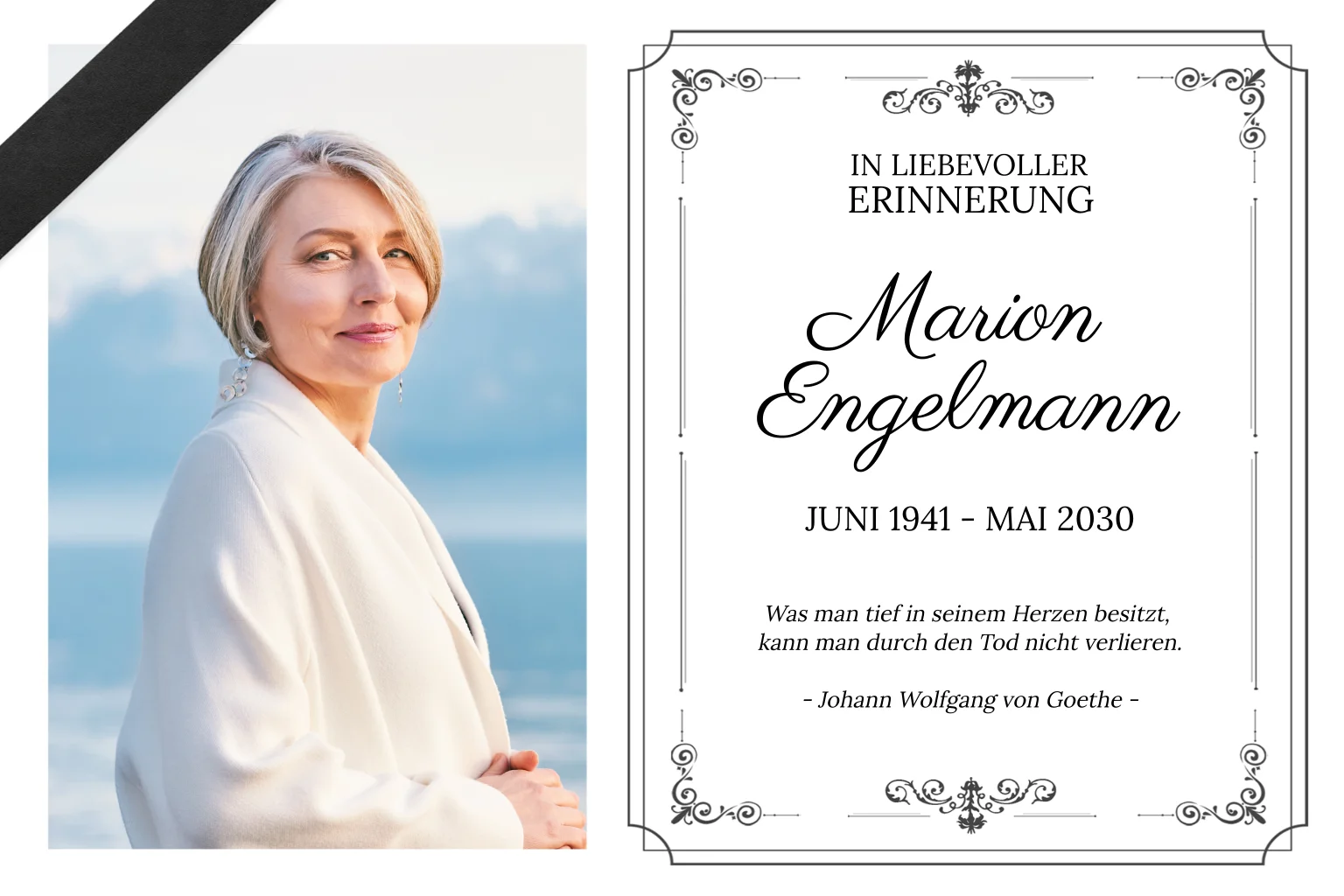 Schlicht und stillvoll zugleich ist diese Trauerkarte mit zahlreichen Ornamenten. Platzieren Sie auf der Frontseite ein Foto, welches oben links einen üblichen schwarzen Trauerstreifen hat und schreiben Sie den Namen und weitere Daten Ihres Herzensmenschen hinzu.