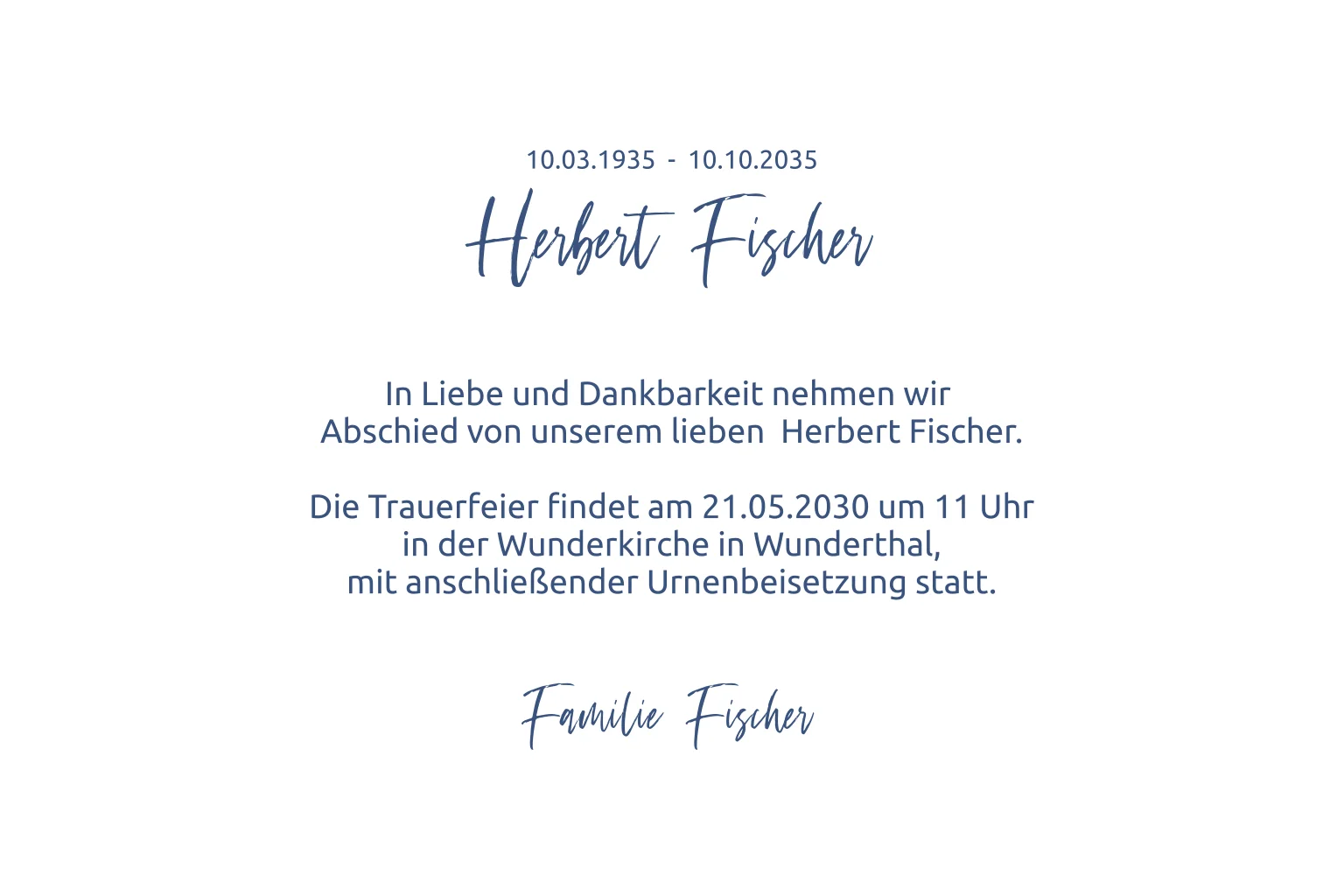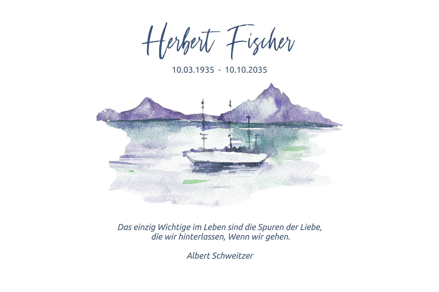 Ein wunderschönes Aquarell eines Segelboots vor einer traumhaften Kulisse aus Wasser und Bergen. Personalisieren Sie diese minimalistische Einladungskarte zur Beerdigung des Verstorbenen. Lassen Sie die Trauernden wissen, dass das Wichtigste die Spuren der Liebe sind, die wir hinterlassen.