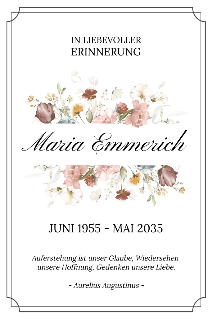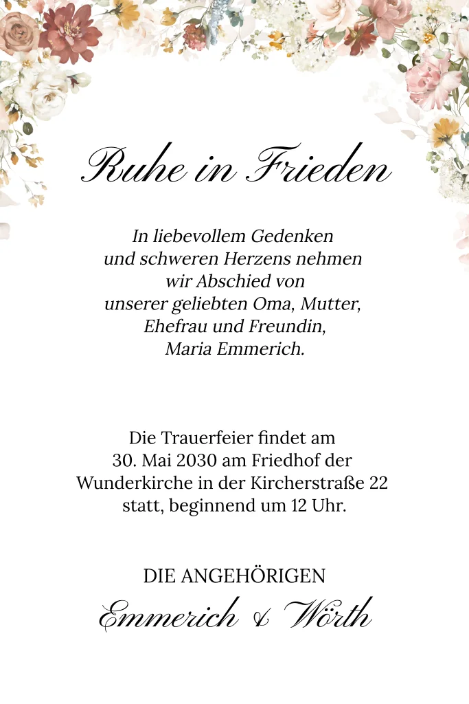 Der Name der verstorbenen Person gebettet in einem Meer aus Wildblumen. Gedenken Sie mit einem schönen Foto an die vergangene Lebenszeit und laden Sie stilvoll zur Trauerfeier ein.